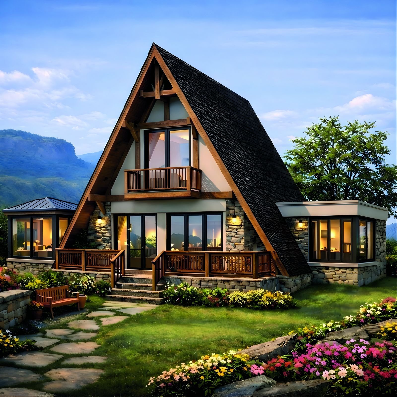 Alpine soul meets Indian skies. A steep A-frame, double-height living, and walls of glass that pull the outside in — engineered around a precision LGS steel frame for any Indian climate.
