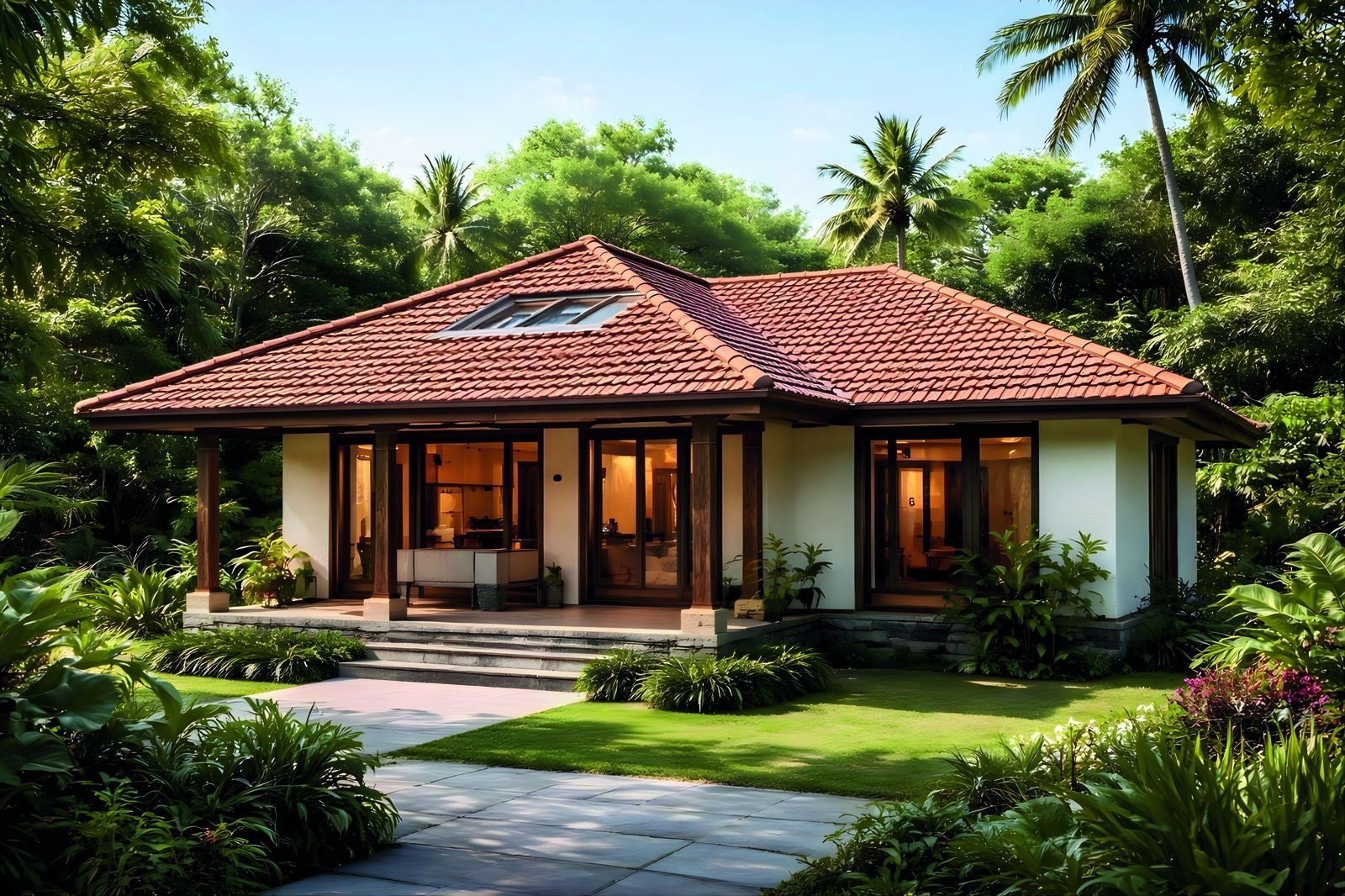 Kerala's courtyard tradition, reimagined for modern comfort. Sloping tiled roofs, deep verandahs, and indoor-outdoor flow that suits warm climates and outdoor living.