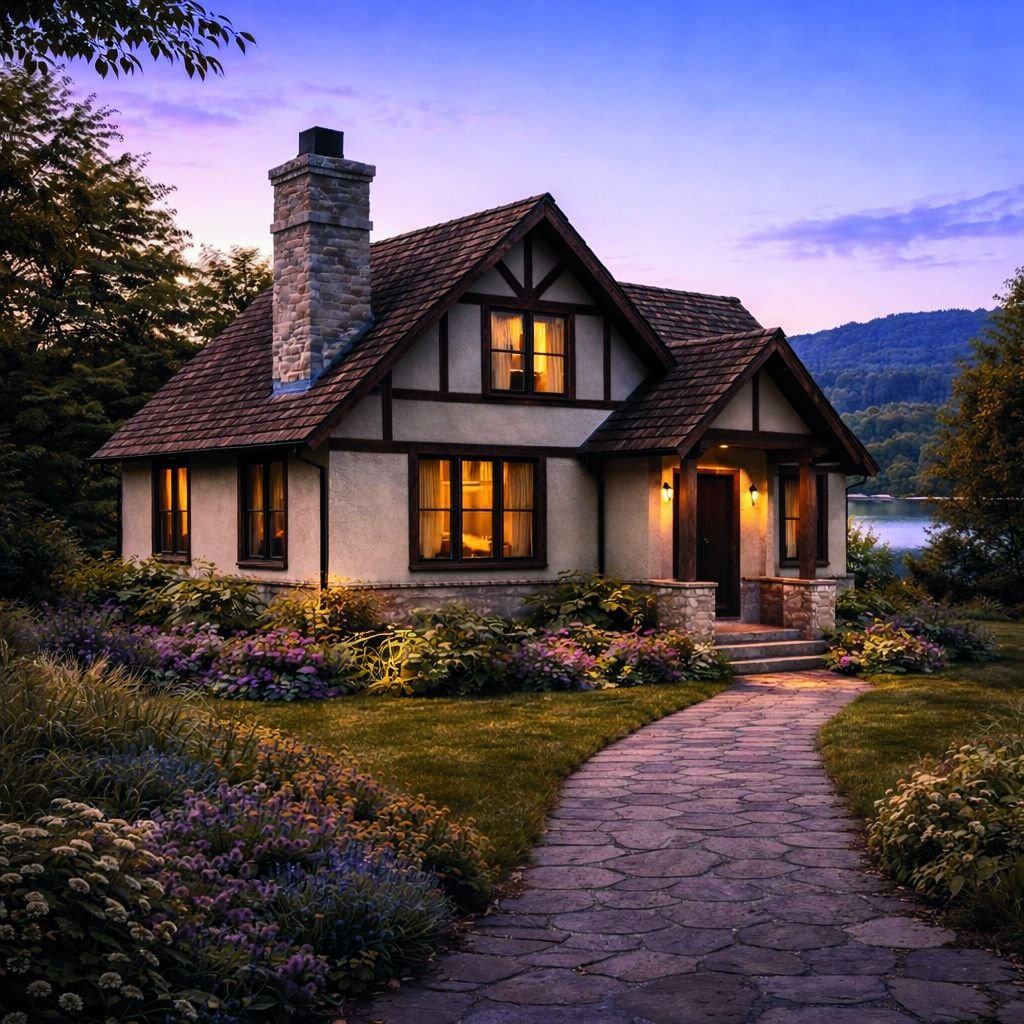 Storybook Tudor prefab cottage at dusk by lake